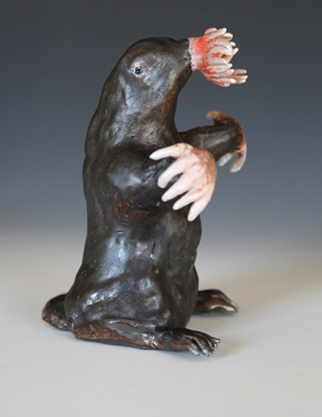 Star-nosed Mole. Brown stoneware and epoxy resin. 6"h x 5"w x 4"d This mole has exceptional abilities due to the unusual sensory organ on its nose. At first glance ugly, its uniqueness has grown on me enough to want to sculpt it. The nose has 22 appendages that feel pressure, vibrations and can discern textures. Having poor eyesight, this star guides them through underground tunnels, and helps them sense food. The oversized hands make them master diggers.