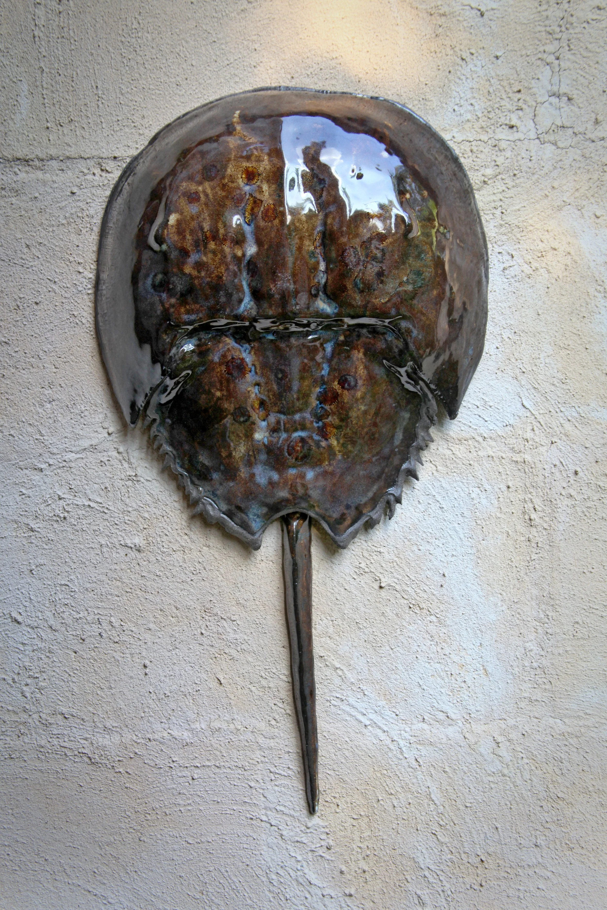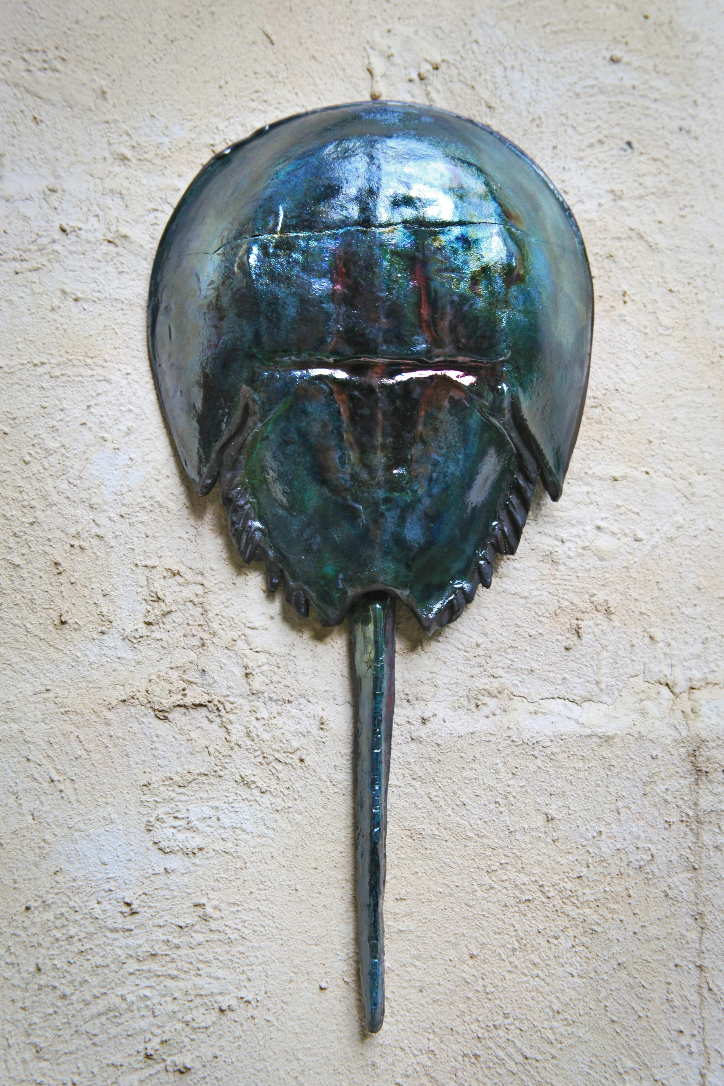 Sn496. Naked Raku Horseshoe Crab Sn496. 23"l x 11"w x 4"d. (Not For Sale) Winner of the Margery Soroka Memorial Award for Outstanding Work