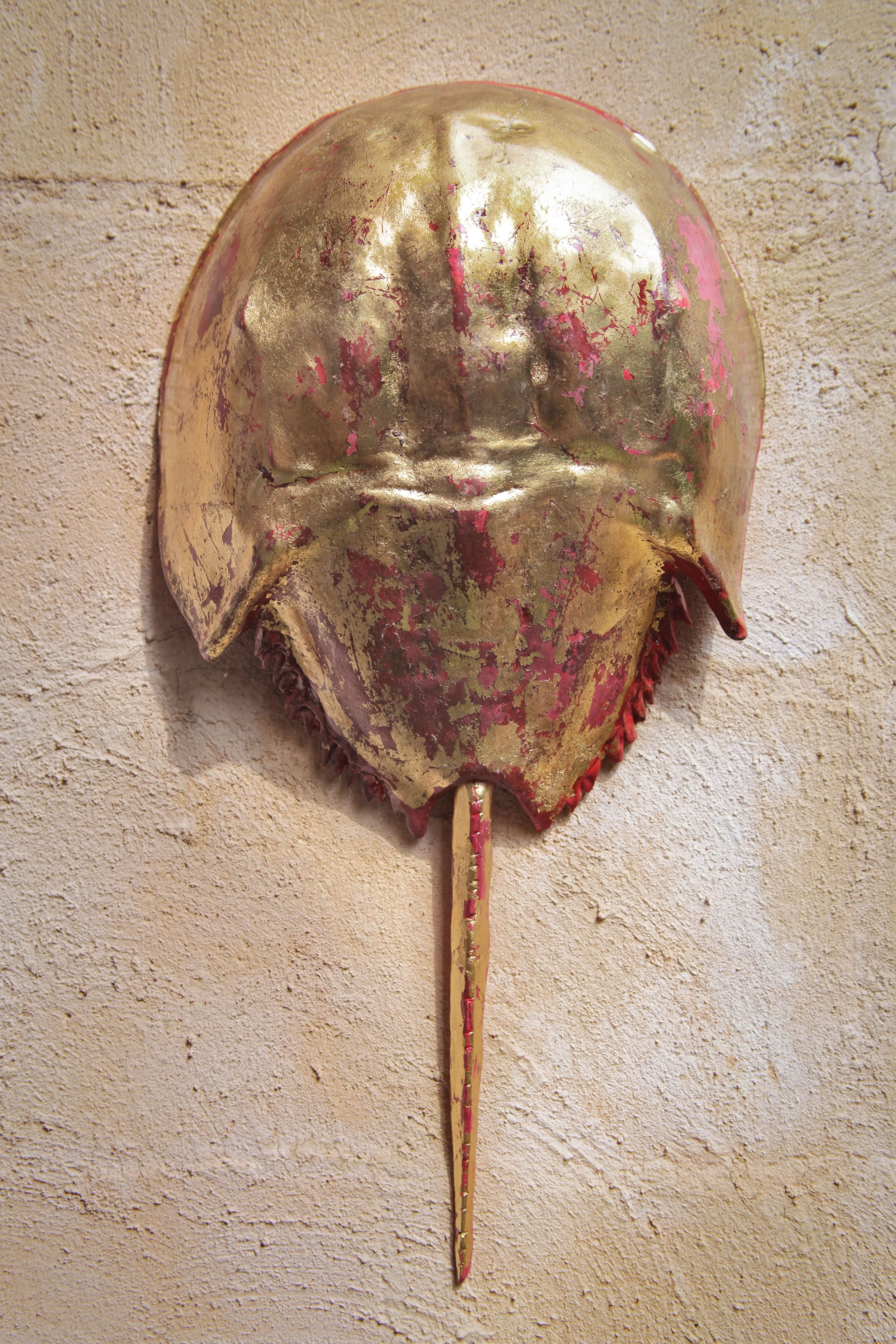 sn 457. Gold Leaf and Red Horseshoe Crab. sn457. 23"l x 11"w x 4"d.